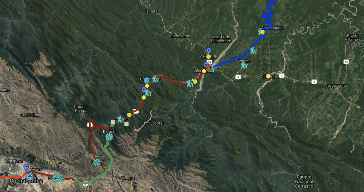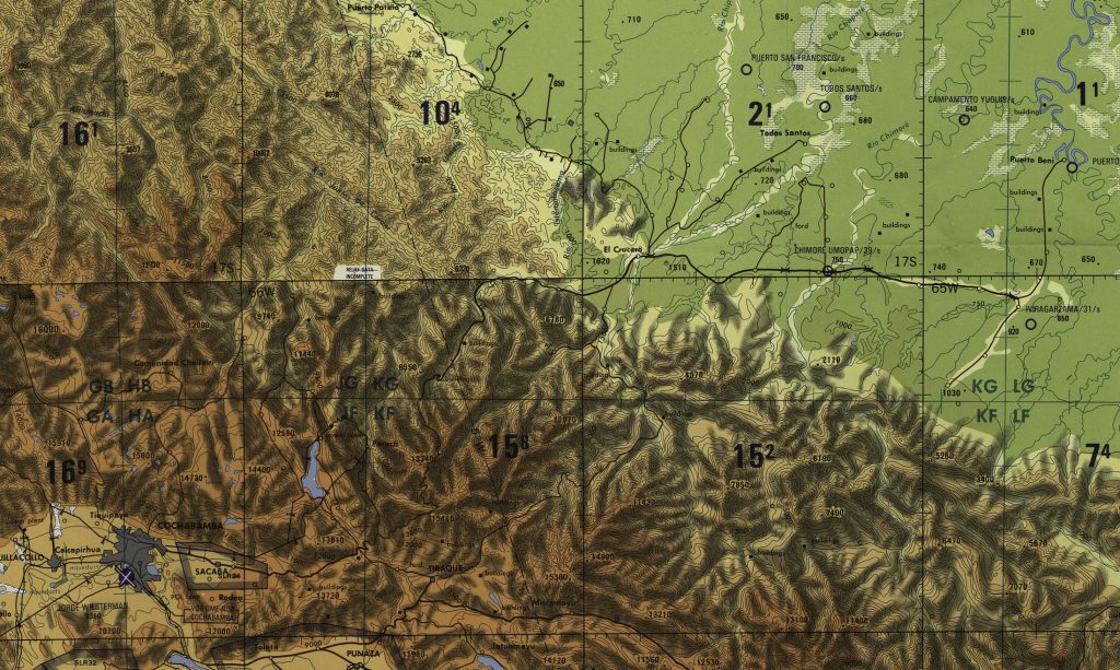 “Construction of the modern highway linking Cochabamba and Villa Tunari also began in 1965. With its completion, in 1972, families from the Andean valleys and highlands of Cochabamba and neighboring departments could establish plots in the tropical valley, and move back and forth between them and land holdings in their home communities. Along this main artery and spreading out on the web of secondary roads and trails being constructed, the population of the Chapare began to grow rapidly, reaching 24,381 people distributed among 54 hamlets by 1967 (Flores and Blanes 1984:82).”
